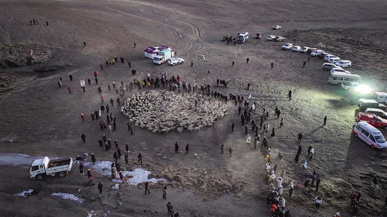 兩名牧羊人牽著威風(fēng)凜凜的牧羊犬,和其他牧羊人分別守在羊群兩側(cè),時(shí)刻維持著隊(duì)伍的秩序。隨著時(shí)間推移,原本泛紫的天空漸漸被日出的光輝染成絢麗的紅色,霞光輕柔地灑在湖邊連綿起伏的雪山上,為雪山勾勒出一圈溫柔的金色輪廓。冰湖上,羊群與牧羊人的身影在晨光的映照下被無限拉長(zhǎng),宛如一幅徐徐展開的古老畫卷,靜謐而美好。