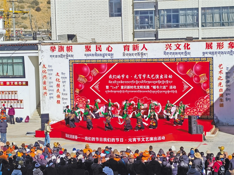 由日喀則市文旅局主辦、日喀則市群眾藝術(shù)館承辦的“我們的節(jié)日·元宵節(jié)文藝演出活動(dòng)暨‘1+3’意識(shí)新時(shí)代文明實(shí)踐‘暖冬六送’活動(dòng)”,在日喀則市群眾藝術(shù)館院內(nèi)舉行?;顒?dòng)在舞蹈《阿吉朗薩》中溫暖開(kāi)場(chǎng),《歡樂(lè)日喀則》《心中的祝?!贰吨袊?guó)夢(mèng)》等節(jié)目掀起了活動(dòng)的高潮,觀眾們手中揮舞的五星紅旗表達(dá)了對(duì)祖國(guó)母親的熱愛(ài)之情和對(duì)幸福生活的感恩之情。