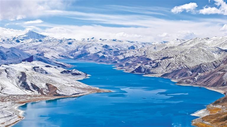 圖為鳥瞰羊卓雍錯(cuò)。記者 洛桑平措 晉巴次成 攝