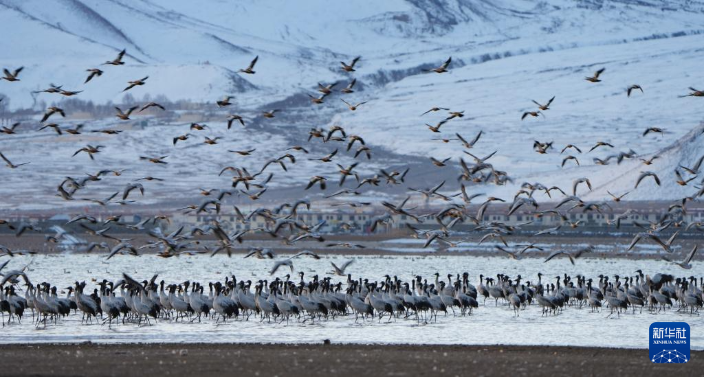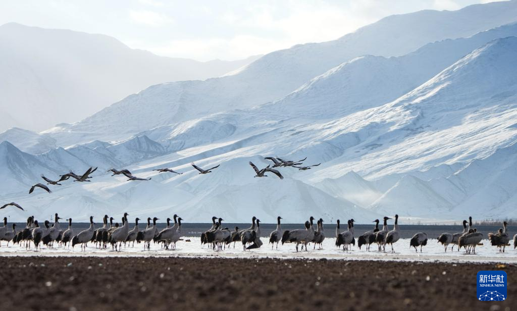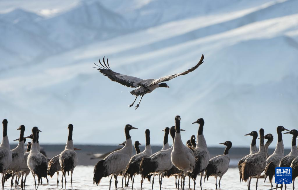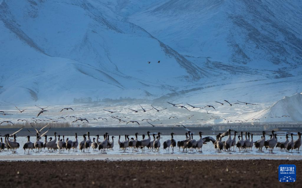 西藏自治區(qū)拉薩市林周縣平均海拔約4200米,是黑頸鶴的主要越冬地之一。一場冬雪,將林周縣虎頭山水庫染成一片銀白,黑頸鶴仿佛是這潔白舞臺(tái)優(yōu)雅的舞者。