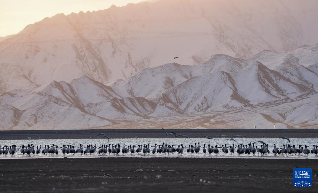 2月20日清晨,第一縷陽光照耀在西藏拉薩市林周縣越冬的黑頸鶴身上。新華社記者 晉美多吉 攝?