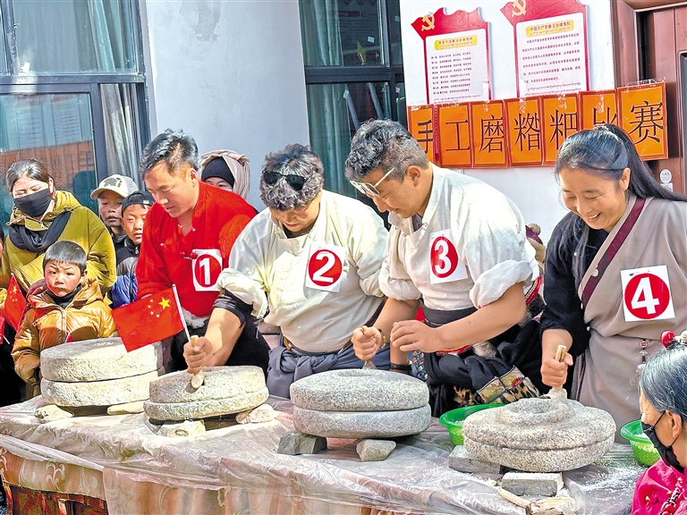 圖為比如縣“鄉(xiāng)村振興 那曲奮進(jìn)”手工磨糌粑比賽現(xiàn)場(chǎng)。 記者 趙書(shū)彬 萬(wàn)靖 攝