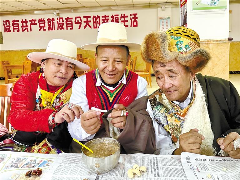 60歲的多吉大爺放牧歸來,推開家門,“古突”的香氣瞬間將疲憊驅(qū)散。“都到齊啦,吃‘古突’嘍!”大兒子格桑多吉一邊招呼,一邊給家人盛上“古突”。房間里,歡聲笑語不斷,處處充滿溫情。