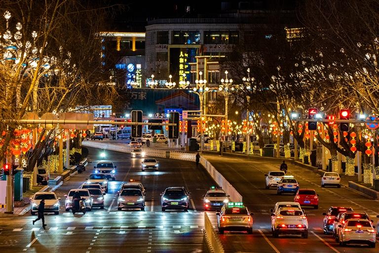 漫步在林廓東路北段、民族南路、北京中路……大街小巷都披上了藏歷新年的盛裝,新年元素琳瑯滿目,處處洋溢著節(jié)日的氣息。夜幕降臨,華燈初上,道路兩側(cè)樹(shù)上的燈籠和燈串開(kāi)啟亮燈模式,街道在燈光的交相輝映下,傳遞出濃郁的年味,流光溢彩的街景也讓拉薩更顯活力,不時(shí)有人用手機(jī)定格此刻的畫面。