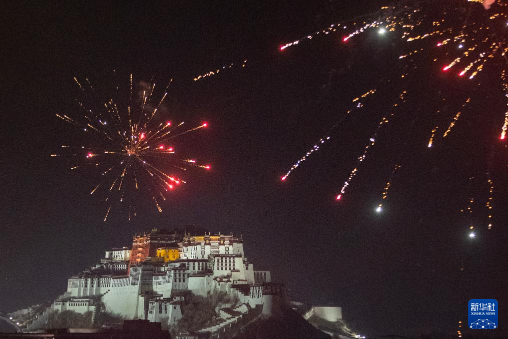 這是“古突”夜煙花映照下的布達拉宮(2月27日攝)。新華社記者 姜帆 攝