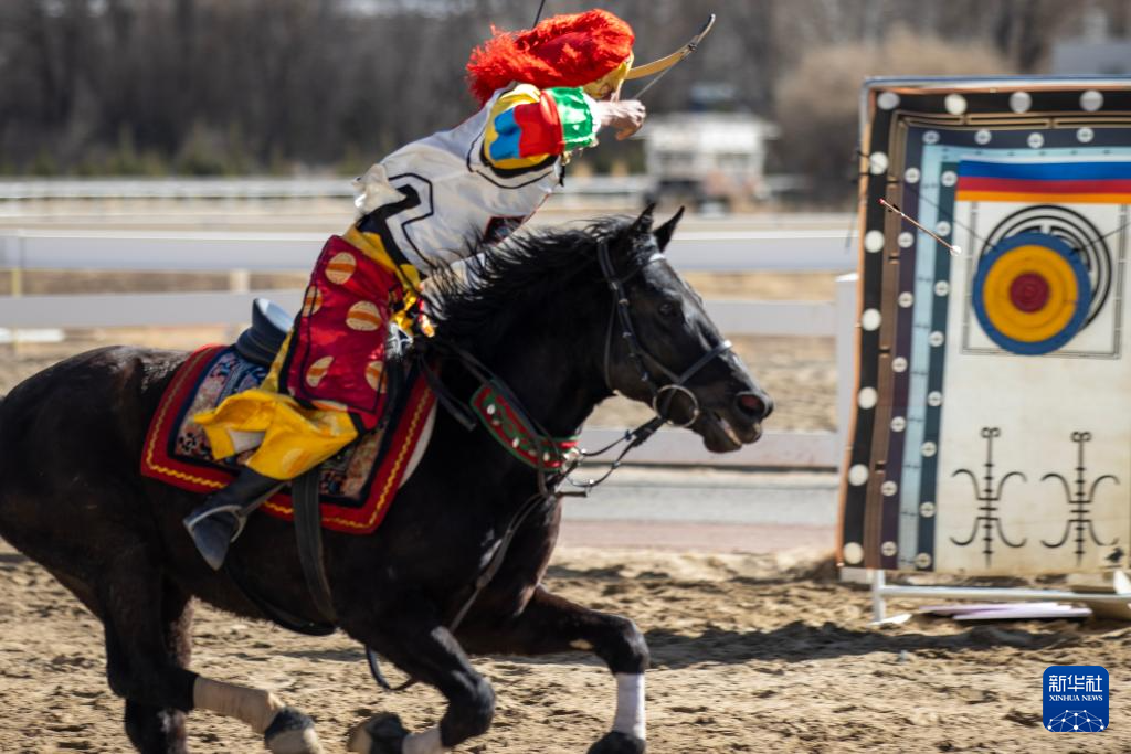 3月2日,馬術隊員在表演傳統(tǒng)馬術項目馬上射箭。新華社記者 晉美多吉 攝??