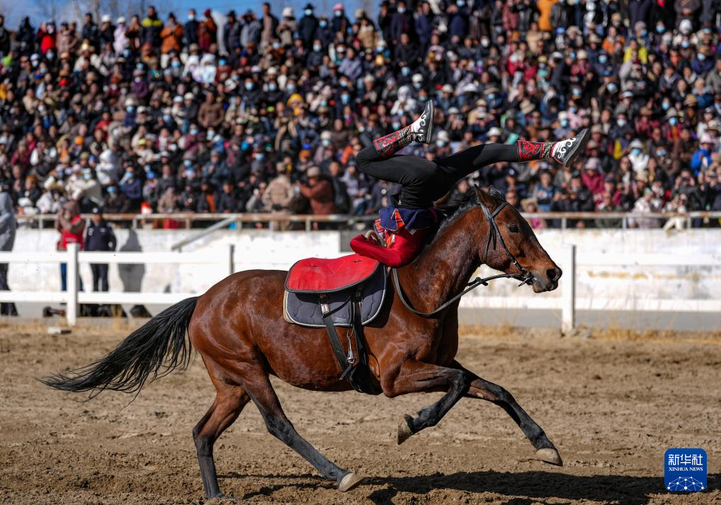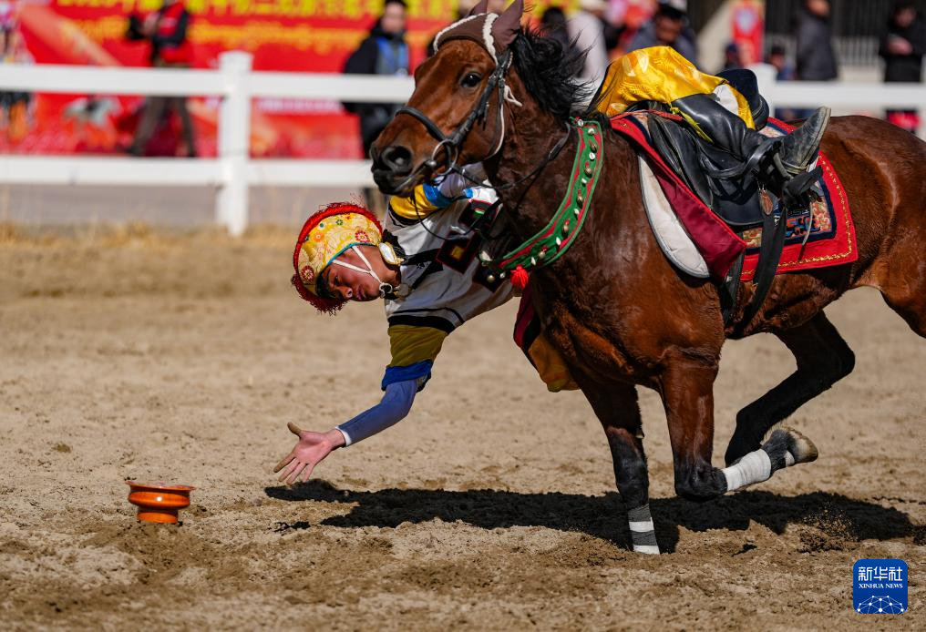 3月2日,馬術隊員在表演傳統(tǒng)馬術項目撿碗。新華社記者 晉美多吉 攝??