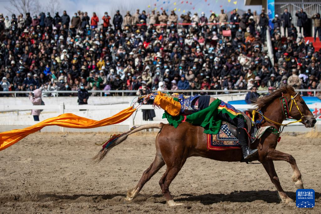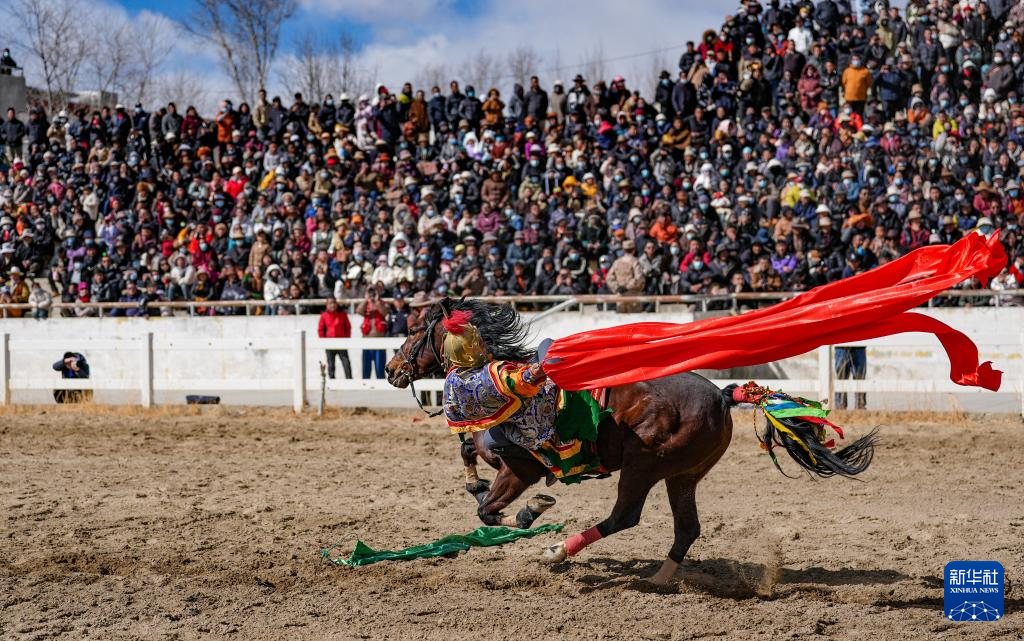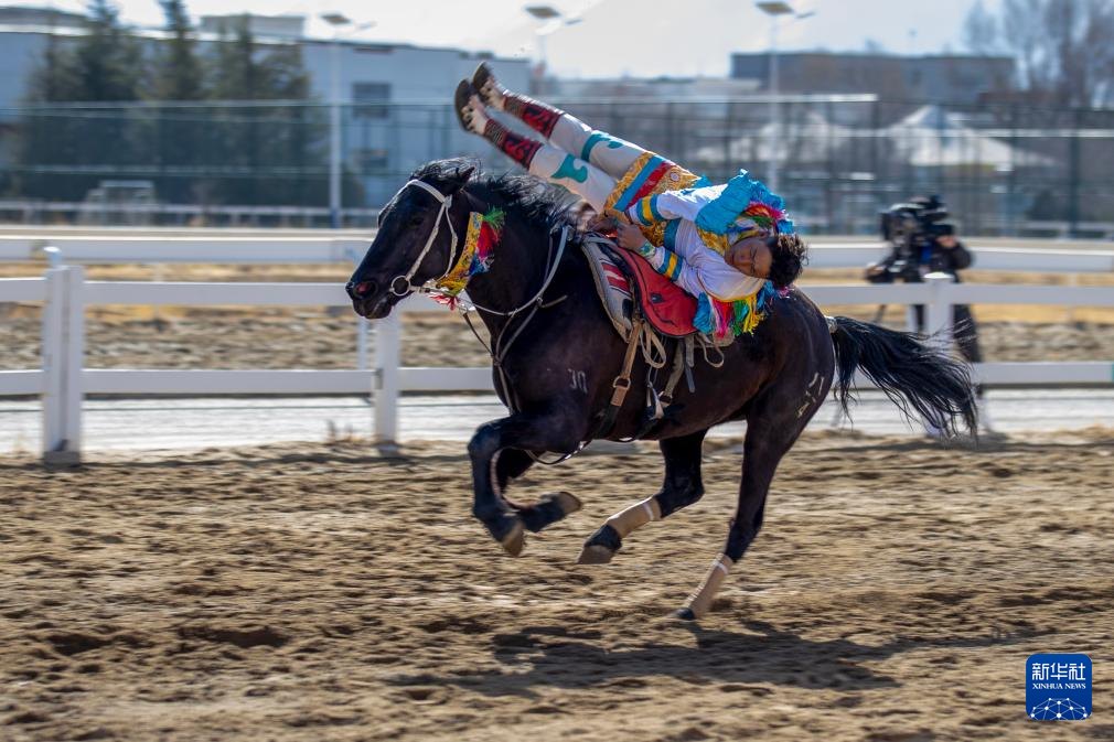 3月2日,馬術隊員在表演傳統(tǒng)馬術項目撿哈達。新華社記者 晉美多吉 攝