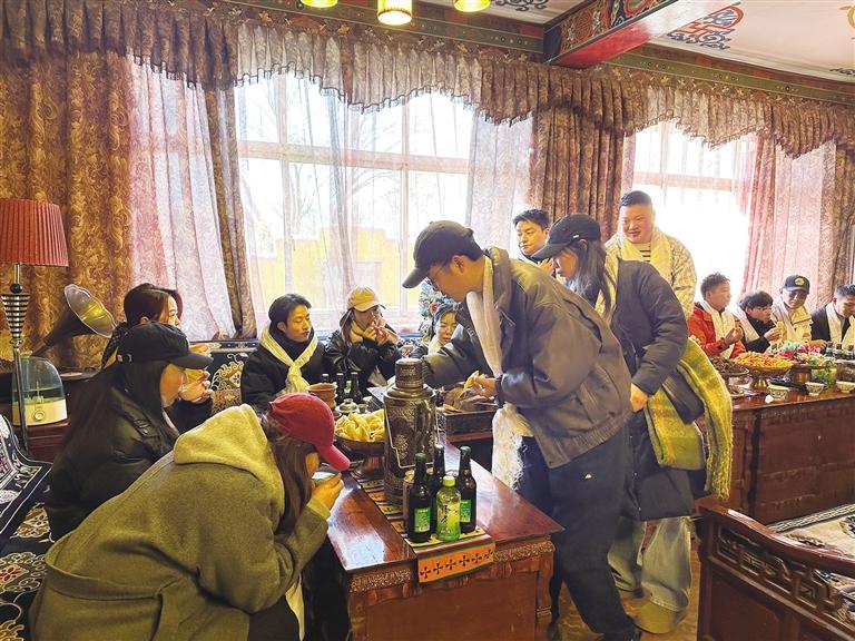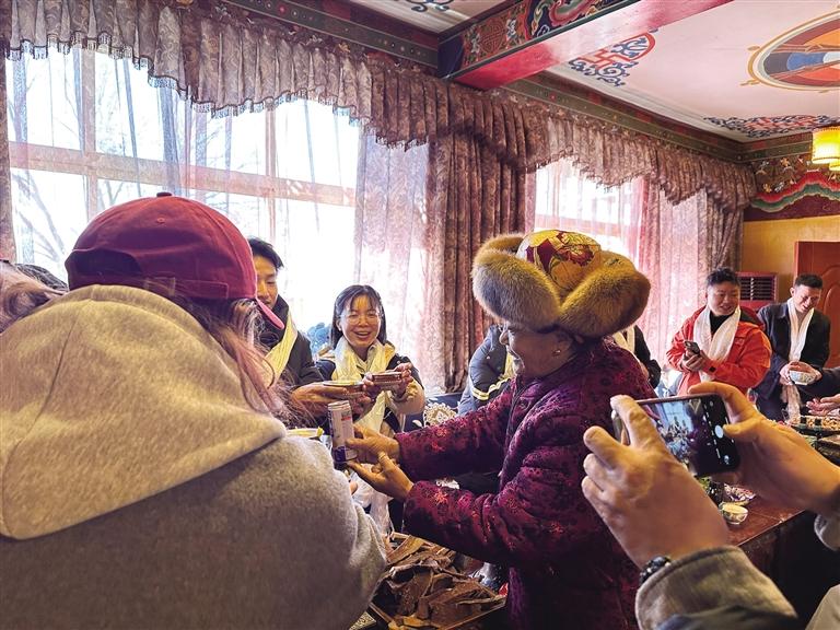 來自東北遼寧的于先生是第一次過藏歷新年,一切都讓他感到新奇不已。他一邊不停地拍照,分享給遠方的家人,一邊興奮地介紹說:“我不僅品嘗到了美味的藏式佳肴,更深入了解了藏歷新年習(xí)俗,這份跨越文化的溫暖與情誼,將成為我記憶中最珍貴的新年禮物,希望明年還有機會過藏歷新年?!庇谙壬脑捳Z,道出了許多游客的心聲。在這個特別的新年里,他們收獲的不僅僅是美食與美景,更是一份深厚的文化體驗和溫暖的情誼。