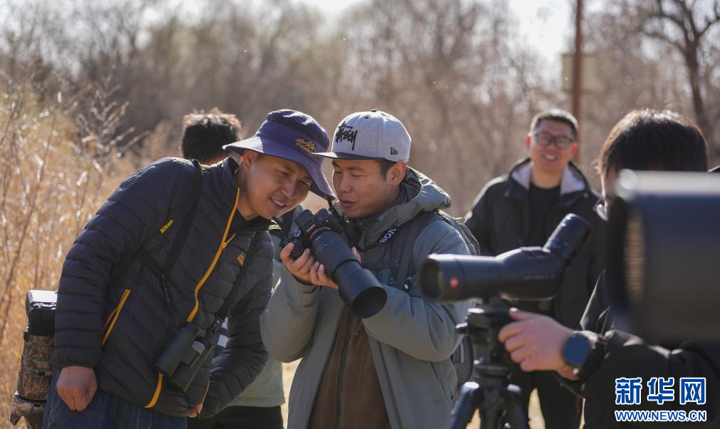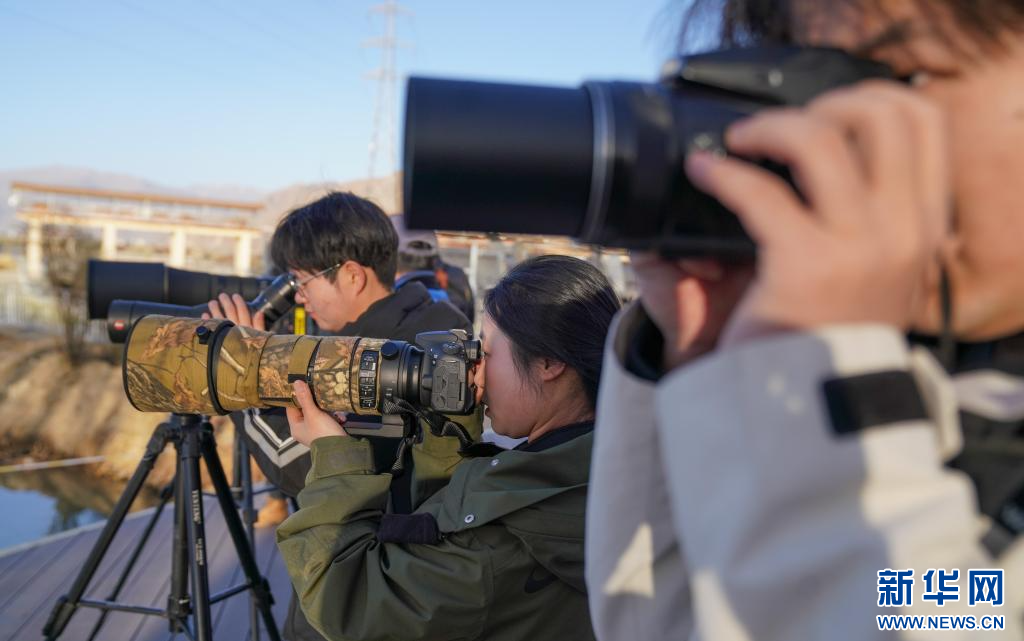 3月29日,參加采風(fēng)活動(dòng)的成員在拉魯濕地觀鳥拍照。(新華社記者 晉美多吉 攝)