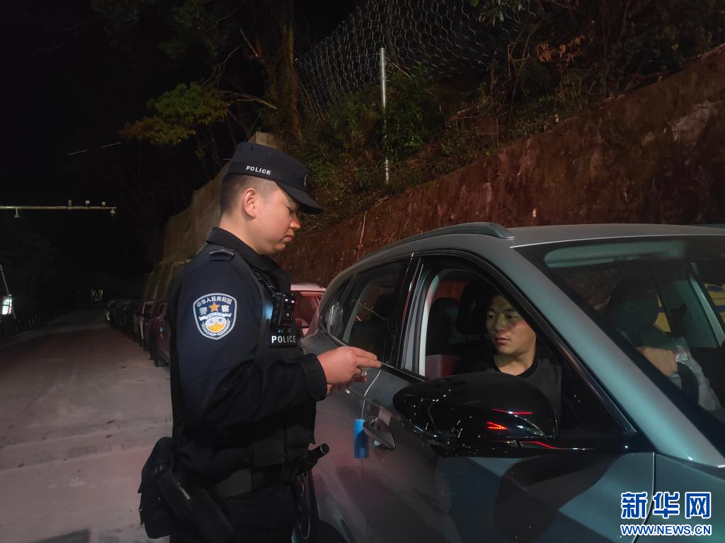 這是民警夜間指導(dǎo)待出口新能源汽車輛??靠诎额A(yù)檢預(yù)放車位。(新華社發(fā) 洛追次仁 攝)