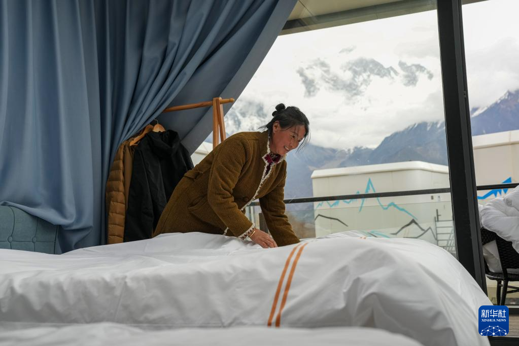 4月4日,林芝索松村一家民宿的服務(wù)員在整理房間。新華社記者 晉美多吉 攝