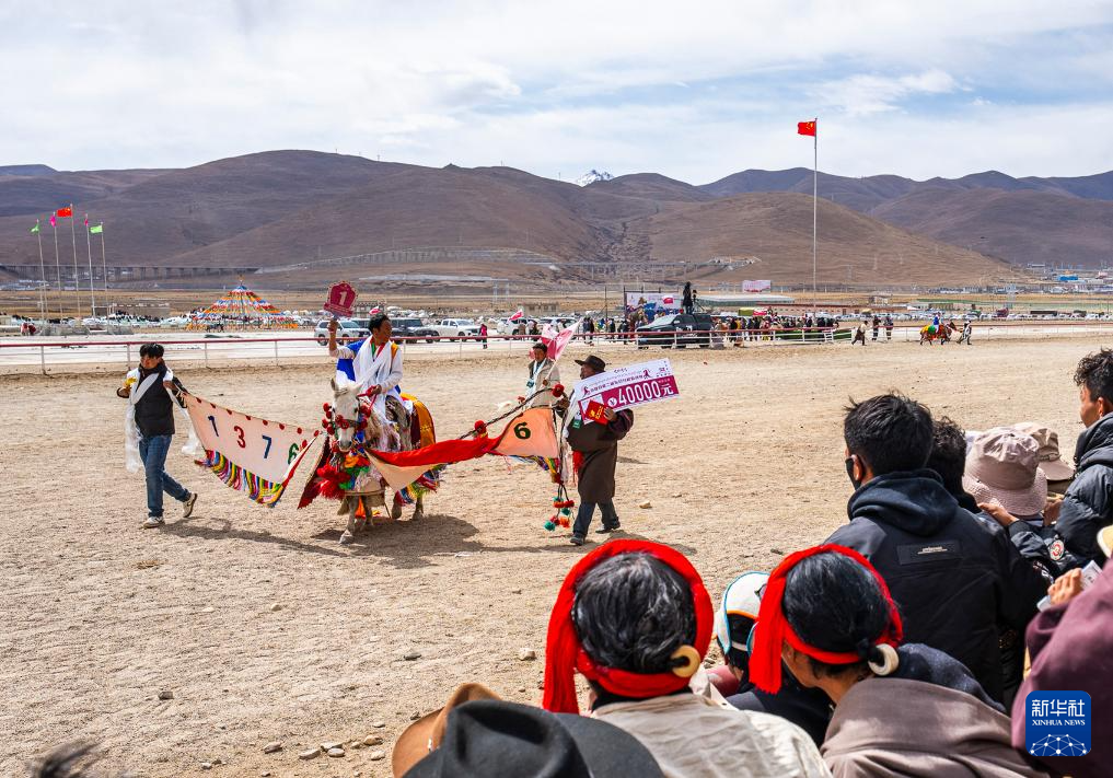 4月27日,來自拉薩曲水縣的馬匹在純藏馬跑馬賽中獲得第一名,馬主接受觀眾歡呼。新華社記者 丁增尼達(dá) 攝