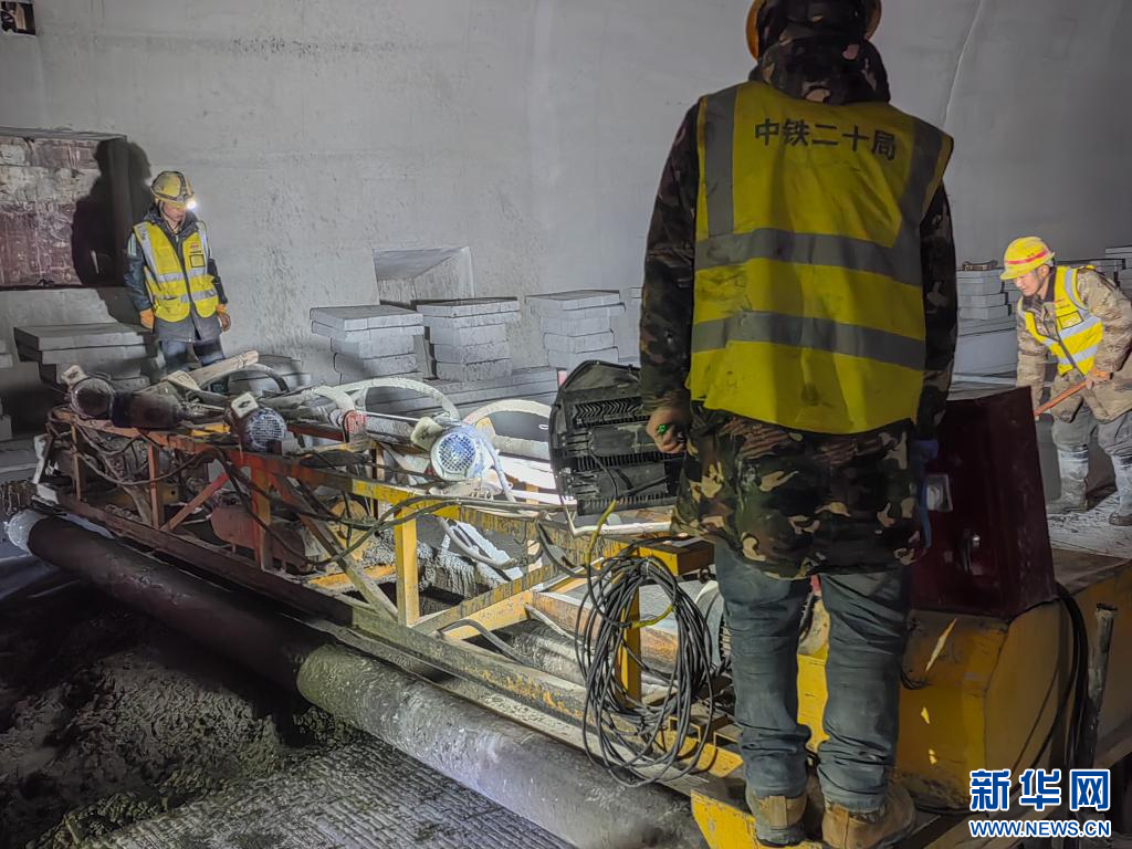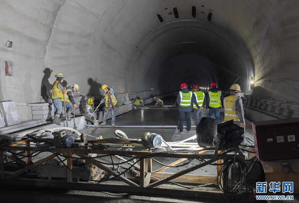 5月3日,工人們在然烏隧道進(jìn)行混凝土路面整平工作。劉強(qiáng) 攝