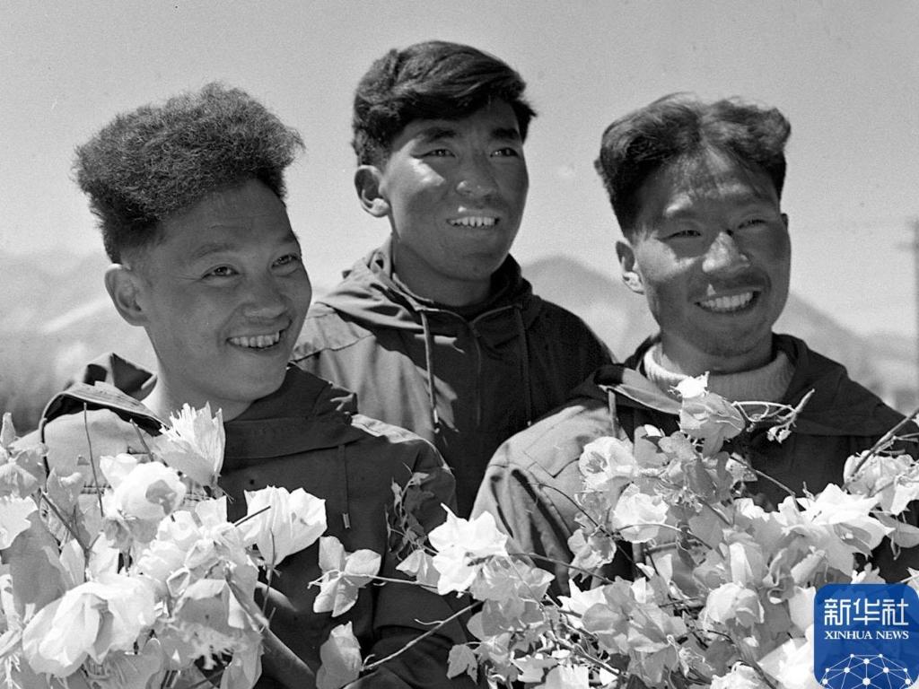 1960年6月7日,王富洲(右)、貢布(中)與屈銀華三人凱旋拉薩后捧花合影。新華社發(fā)(陳珺 攝)