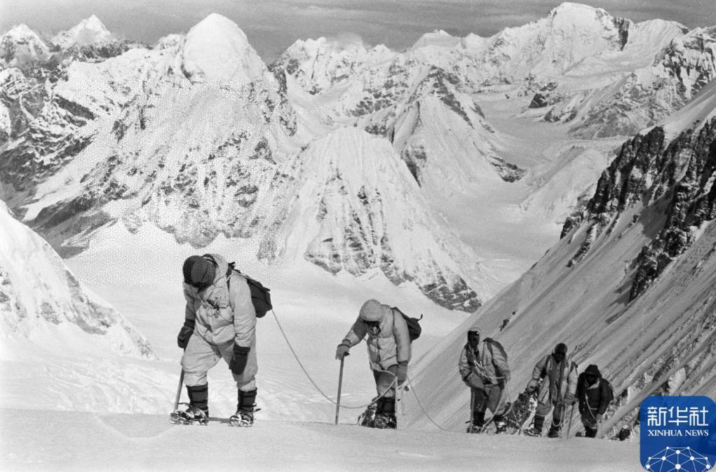 1960年5月,中國登山隊隊員在海拔7150米的冰雪坡上行進。新華社發(fā)(曾曙生 攝)