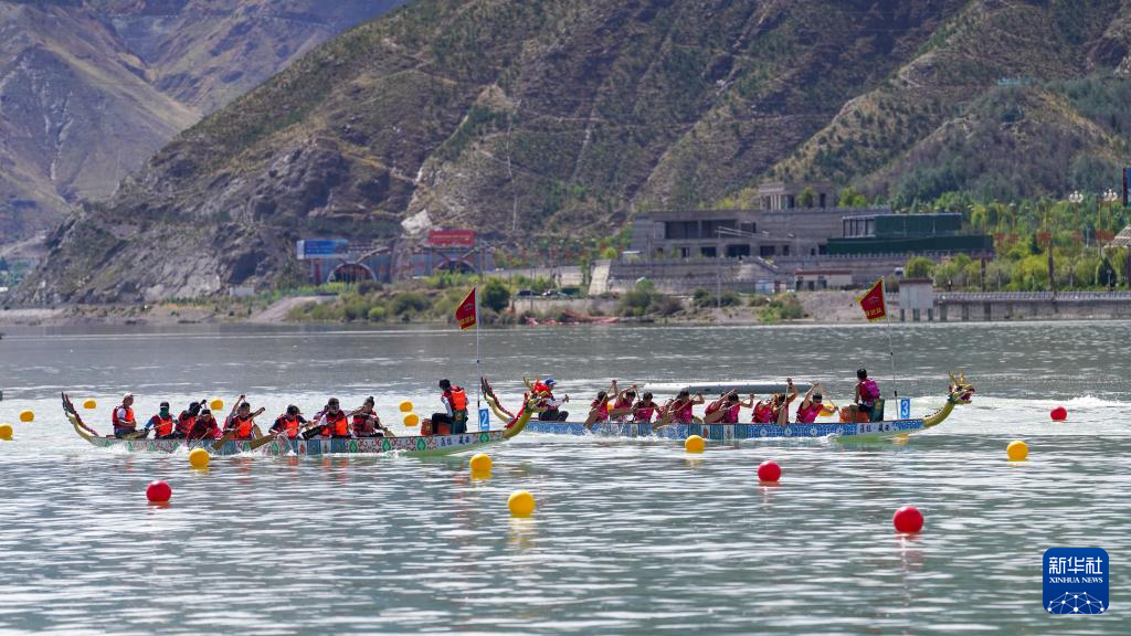 5月31日,參賽隊(duì)伍在龍舟比賽中。新華社記者 晉美多吉 攝 ??