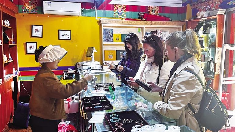 國際旅行商在文創(chuàng)店內(nèi)購買紀念品。