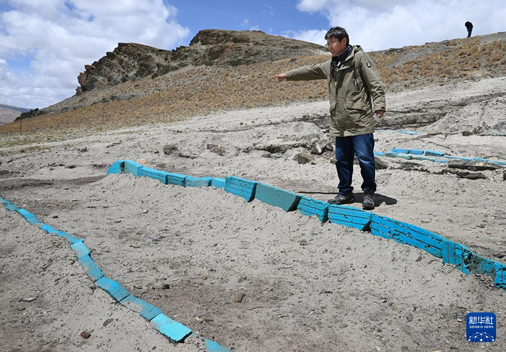 5月22日,聯(lián)合考古隊領(lǐng)隊夏格旺堆在瑪不錯遺址I區(qū)南部介紹該位置的一處墓地發(fā)掘情況。新華社記者 李賀 攝