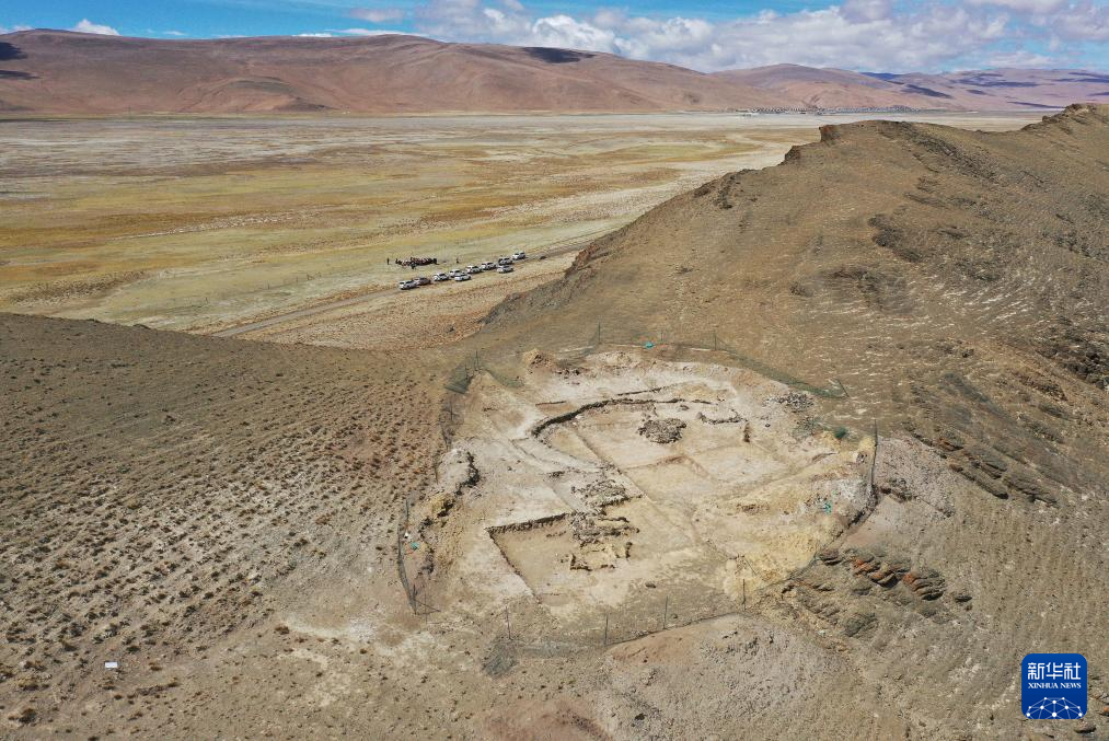 這是5月22日拍攝的坐落在瑪不錯湖畔的遺址第四期石構(gòu)地面建筑考古發(fā)掘現(xiàn)場(無人機照片)。新華社記者 李賀 攝  ??