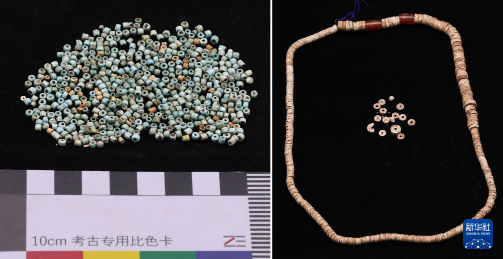 ?這是瑪不錯遺址出土的費昂斯珠(左)和帶有紅玉髓的滑石珠串(拼版照片)。新華社發(fā)(西藏自治區(qū)文物保護研究所供圖)