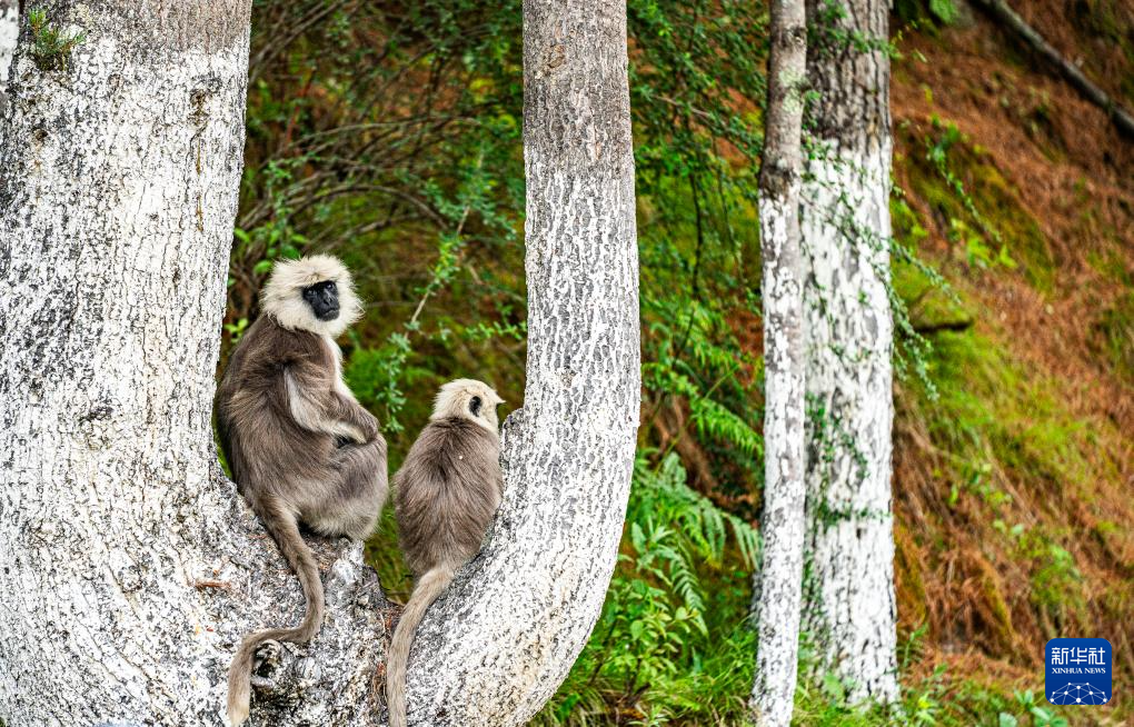 6月20日,在日喀則市亞?wèn)|縣,兩只長(zhǎng)尾葉猴在樹(shù)上休息。新華社記者 丁增尼達(dá) 攝