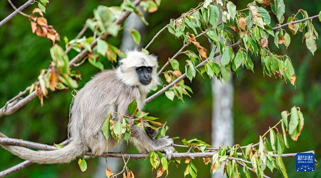 6月20日,在日喀則市亞?wèn)|縣,一只長(zhǎng)尾葉猴在吃樹(shù)葉。新華社記者 丁增尼達(dá) 攝 ??