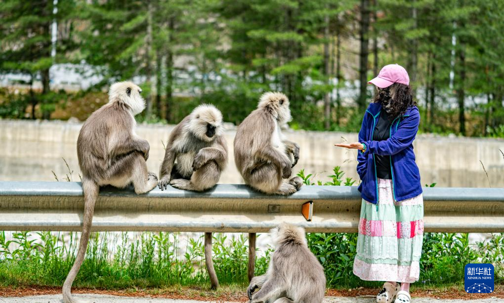 6月20日,在亞?wèn)|縣一條公路邊,游客在和長(zhǎng)尾葉猴互動(dòng)。新華社記者 丁增尼達(dá) 攝 ??