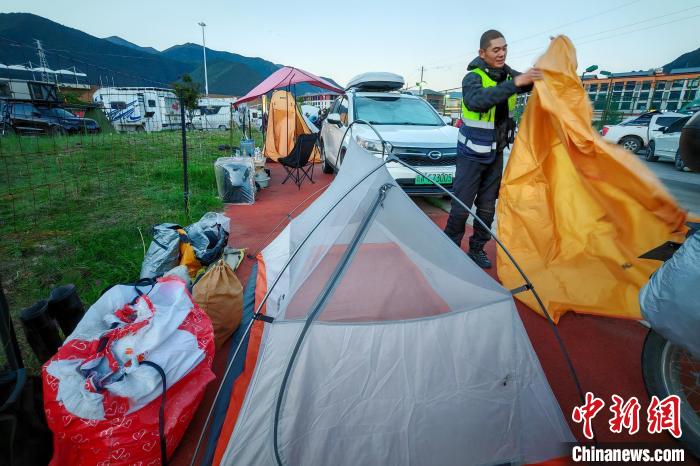 6月26日,摩旅理發(fā)師李秋實到達西藏林芝宇拓公園自駕露營地,搭建帳篷準(zhǔn)備過夜。中新社記者 江飛波 攝