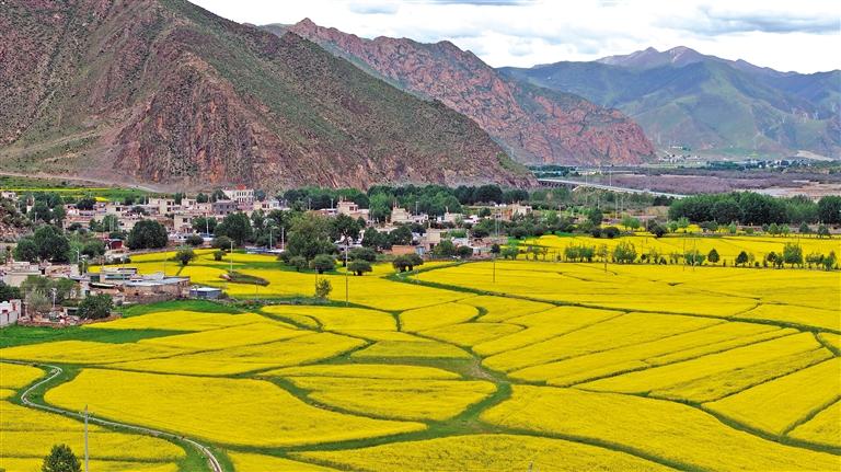 盛夏時節(jié),拉薩市墨竹工卡縣的萬畝油菜花迎來盛花期,金黃色的花海與高原特有的藍天白云相映成趣,構成一幅壯美的自然畫卷。近年來,墨竹工卡縣適度擴大油菜種植規(guī)模、舉辦油菜花旅游推介會等,大力發(fā)展小菜籽油特色產業(yè),推動產業(yè)發(fā)展和群眾增收致富。