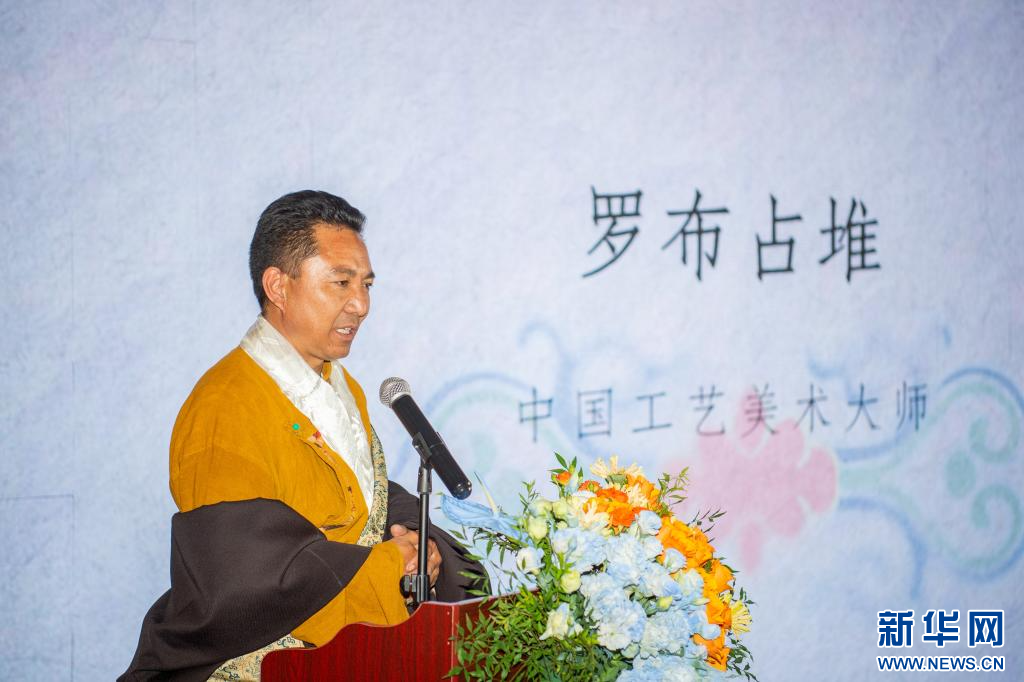 7月7日,中國(guó)工藝美術(shù)大師羅布占堆在活動(dòng)現(xiàn)場(chǎng)交流發(fā)言。新華網(wǎng) 旦增努布 攝