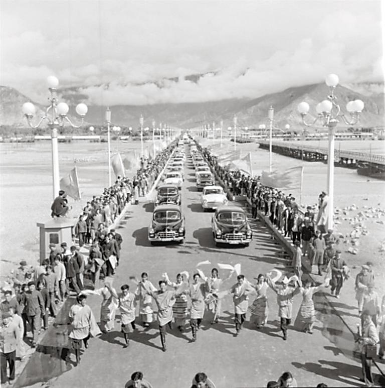 1965年拉薩大橋建成通行時(shí)的場(chǎng)景(資料圖片)。