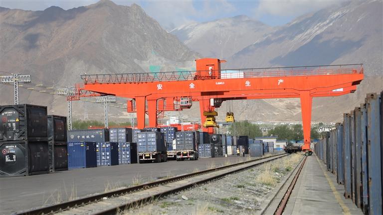 圖為拉薩西站貨場(chǎng)龍門吊正在作業(yè)。 記者 文鳳 通訊員 周悅翔 攝