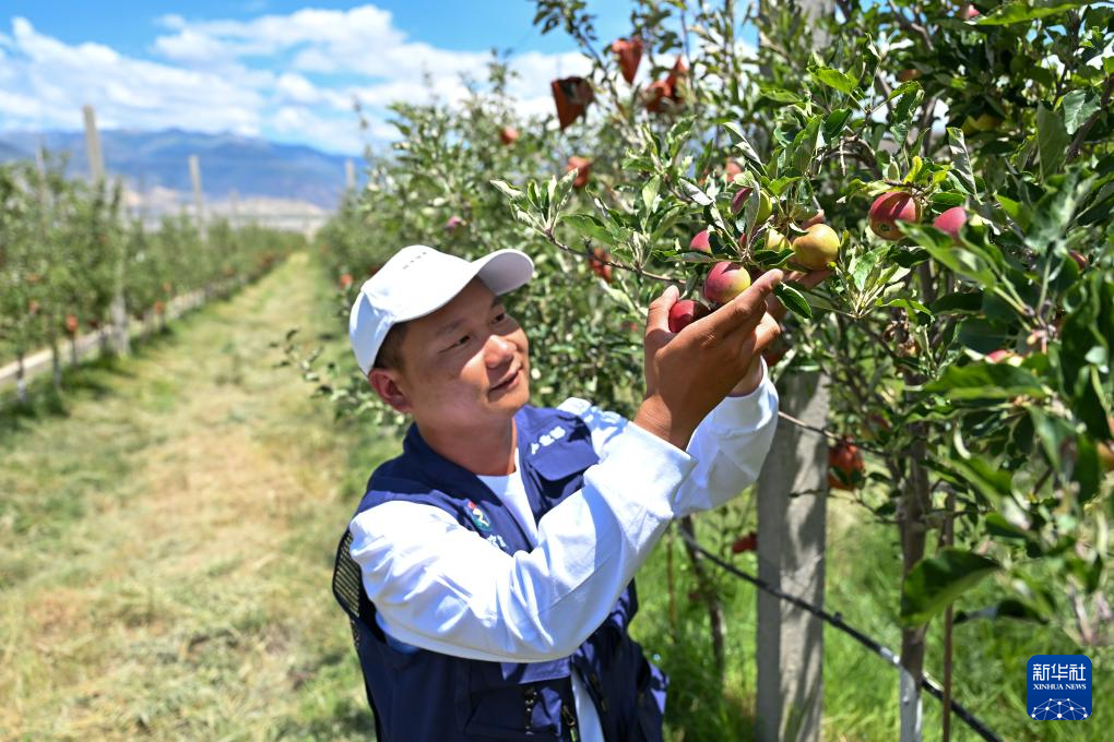 7月19日,西藏扎囊縣的矮化蘋果種植園區(qū)的工作人員查看蘋果長勢。新華社記者 李鑫 攝 ??