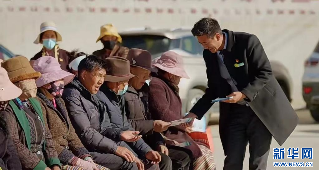 ??工作人員阿旺旦增為扎洞村群眾宣講金融知識,并介紹“庭院經(jīng)濟(jì)貸”相關(guān)業(yè)務(wù)。(中國農(nóng)業(yè)銀行股份有限公司山南分行供圖)