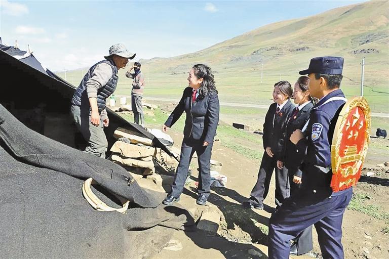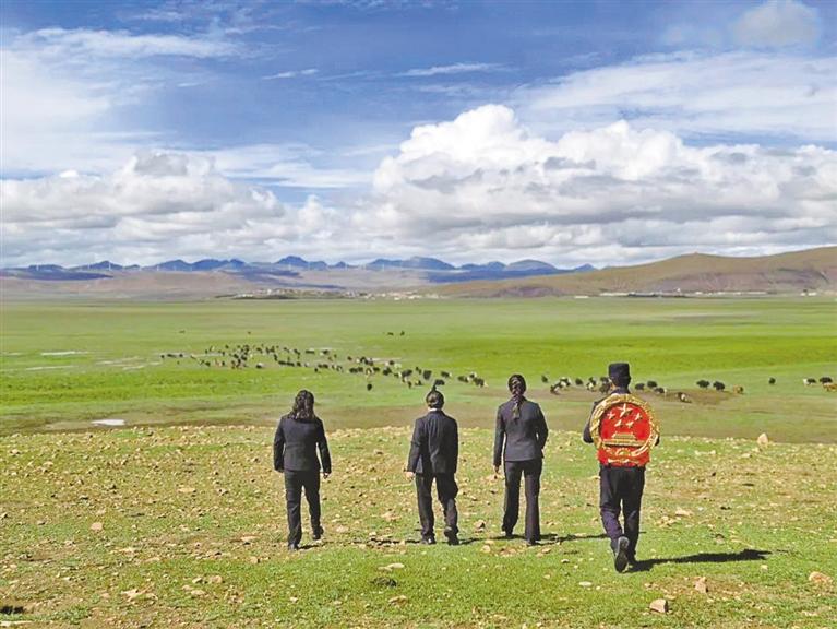 在廣袤的草原深處,牧民群眾的黑帳篷與成群的牛羊構(gòu)成人與自然和諧共生的畫卷。措美縣人民法院干警來到放牧點(diǎn),圍坐于牧民群眾間,用通俗易懂的語言打開話匣子?!按笫?,您看這草場(chǎng)上的植被,要是過度放牧,來年就長不出這么好的草了,牛羊沒了口糧,咱們的日子也受影響不是?”