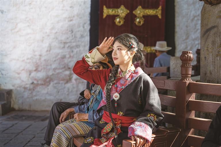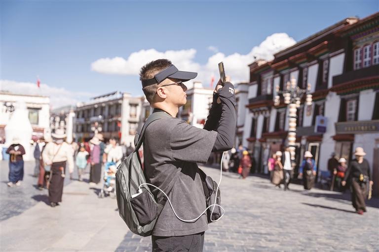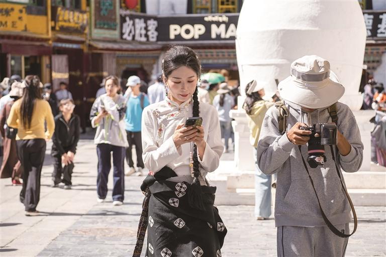 街巷里,來自五湖四海的游客們開始穿梭在八廓街蜿蜒曲折的街巷中。他們滿懷好奇,感受著這里獨特的風土人情。不少游客興致勃勃地穿上一套精美的藏裝,搖身一變成為高原上美麗的“卓瑪”與帥氣的“扎西”。他們在古街的每一個角落留下自己的身影,臉上洋溢著對這片土地的喜愛與贊嘆。