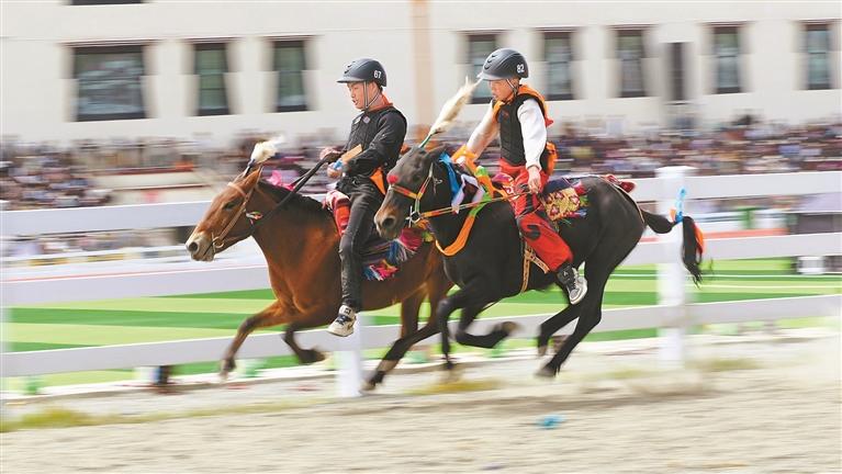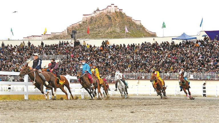 “達(dá)瑪”藏語意為“跑馬射箭”。每年的達(dá)瑪節(jié),賽馬都會(huì)吸引十里八鄉(xiāng)的人們前來觀賽。賽馬場(chǎng)上人頭攢動(dòng),隨著發(fā)令聲響,一匹匹駿馬如離弦之箭沖出起跑線,騎手俯身貼在馬背上,揚(yáng)鞭馳騁,你追我趕,奮勇爭(zhēng)先。觀眾席上,人們隨著比賽節(jié)奏,時(shí)而激動(dòng),時(shí)而安靜,時(shí)而歡呼,時(shí)而嘆息。藏族阿媽次仁卓嘎難掩激動(dòng),她告訴記者,幾乎每年都會(huì)和家人來看賽馬。賽場(chǎng)上,選手們堅(jiān)韌不拔、昂揚(yáng)向上的精神風(fēng)貌讓人動(dòng)容,也激勵(lì)著一代又一代英雄城兒女為祖國(guó)發(fā)展繁榮而不懈奮斗。