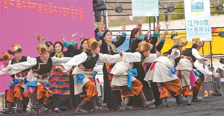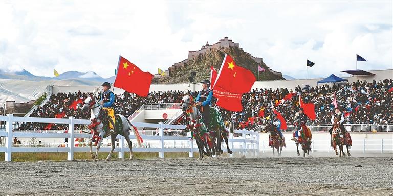 開幕式上,100匹駿馬踏著鼓點(diǎn)奔騰而來。騎手們手持國(guó)旗,馬鬃飛揚(yáng),金黃的青稞穗與潔白的哈達(dá)交織成畫。緊隨其后的方隊(duì)演繹著傳統(tǒng)與現(xiàn)代的對(duì)話,深情表達(dá)了江孜人民對(duì)黨的無限感恩、對(duì)祖國(guó)的無限熱愛、對(duì)西藏繁榮發(fā)展的美好祝愿。