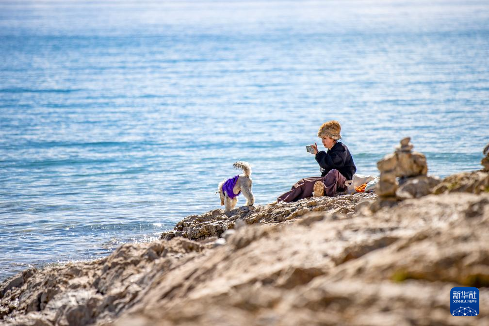 游客帶著寵物狗在納木錯(cuò)湖邊拍照(9月16日攝)。新華社記者 姜帆 攝