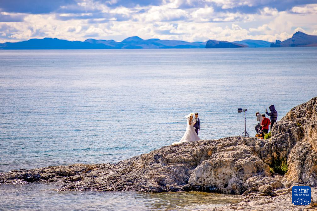 游客在納木錯(cuò)湖邊拍攝婚紗照(9月16日攝)。新華社記者 姜帆 攝