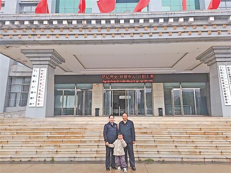 近日,阿旺慈誠和兒媳斯朗拉姆以及孫子羅松江永在縣政府大樓前的合影。記者 平措郎加 周婷婷 貢秋曲措 攝