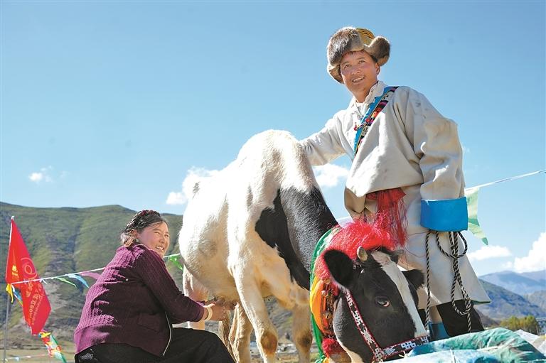 薩迦縣慶祝2025年中國農(nóng)民豐收節(jié)系列活動中的奶牛擠奶比賽現(xiàn)場。