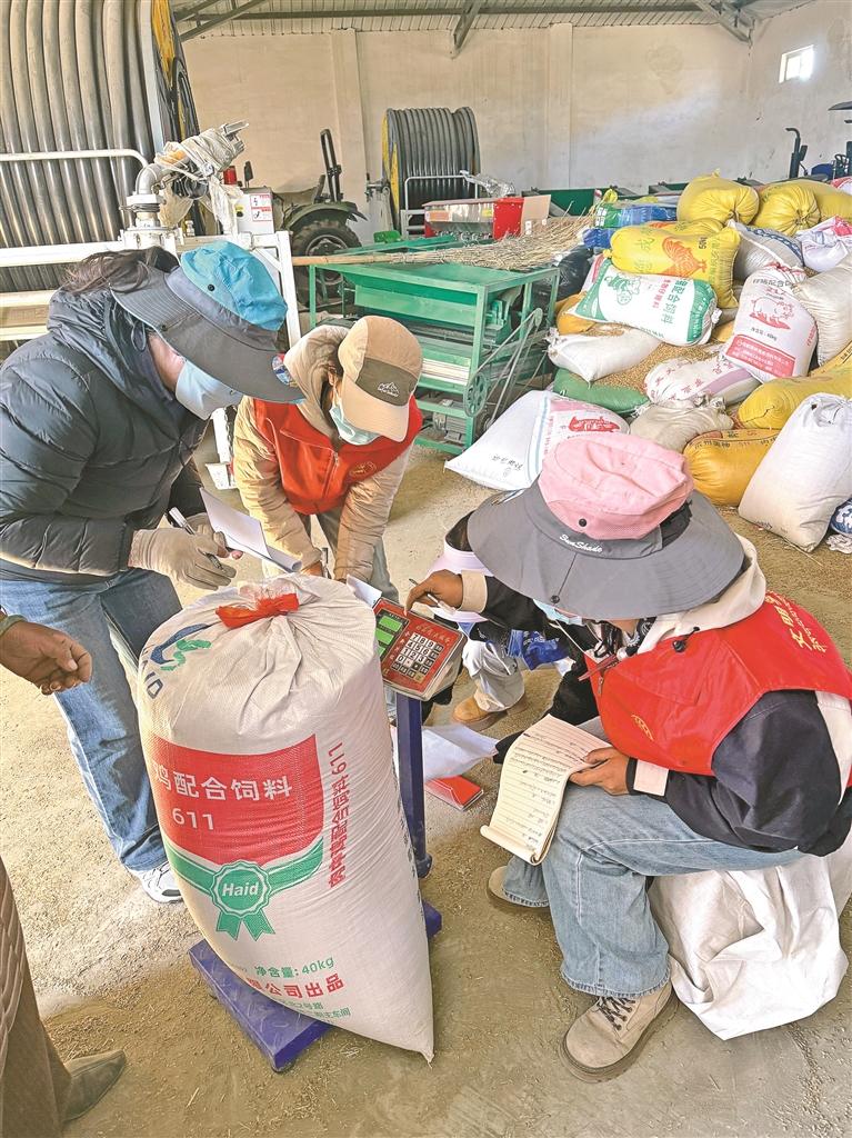 這些“尖兵”一邊當(dāng)起產(chǎn)量計量員,拉著專業(yè)秤具挨家挨戶跑。在糧倉門口,新時代文明志愿者赤列平措蹲在地上調(diào)秤,搭檔德吉拉珍拿著本子記錄,每袋青稞都要稱兩遍才下筆。“這可是農(nóng)戶一年的血汗錢,半點不能馬虎?!背嗔衅酱氩林~頭的汗說,他們針對獨居老人、缺勞力家庭開展上門服務(wù),光仁增倫珠家就精準(zhǔn)計量了1806.6斤青稞,還幫老人把數(shù)字清清楚楚記在掛在墻上的賬本里。