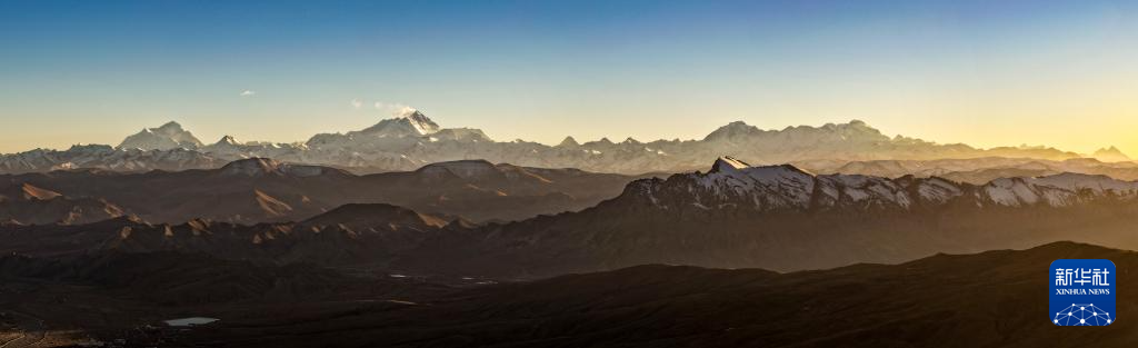11月13日黃昏在定日縣拍攝的喜馬拉雅山脈,自左至右的高峰分別是洛子峰、珠穆朗瑪峰、卓奧友峰和希夏邦馬峰(無人機照片)。新華社記者 姜帆 攝