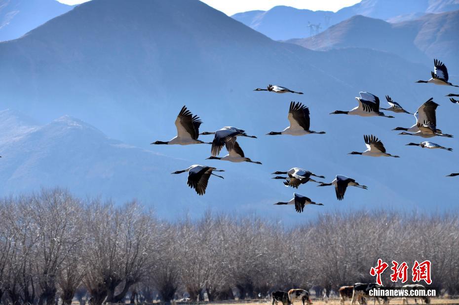 11月14日,西藏日喀則市桑珠孜區(qū)邊雄鄉(xiāng)越冬的黑頸鶴。黑頸鶴是全球十五種鶴類(lèi)中唯一在高原地區(qū)繁殖和越冬的鶴類(lèi),屬中國(guó)國(guó)家一級(jí)保護(hù)動(dòng)物。每年10月中下旬左右,黑頸鶴陸續(xù)飛抵雅魯藏布江中游河谷等地越冬。它們漫步田間地頭、悠閑覓食,為雪域高原的冬日增添了一道靈動(dòng)的風(fēng)景線。中新社記者 李林 攝
