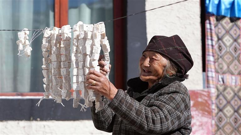 洛桑塔杰的老伴在晾曬奶渣。