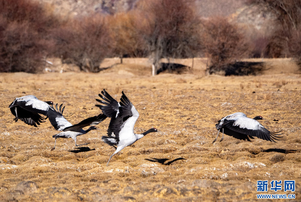 這是11月26日在西藏拉薩市林周縣境內(nèi)拍攝的黑頸鶴。新華網(wǎng) 旦增努布 攝
