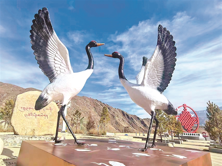 圖為哲蚌寺民族團結主題公園內的拉薩市鳥黑頸鶴雕塑。記者 盧文靜 攝