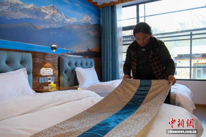 2025年11月9日,西藏林芝巴松措景區(qū)結巴村村民索朗拉姆整理客房,據悉,她的客棧擁有15間客房。江飛波 攝